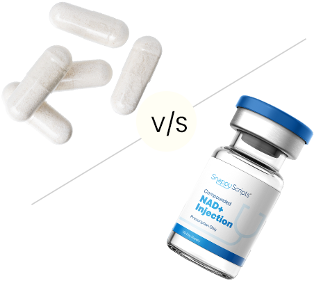 Oral NAD+ supplements can lose potency in digestion — injections bypass the gut, delivering NAD+ directly into the bloodstream for superior absorption & faster effects.